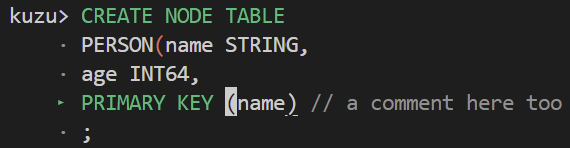 lbug> CREATE NODE TABLE Person (name STRING PRIMARY KEY, age INT64);
