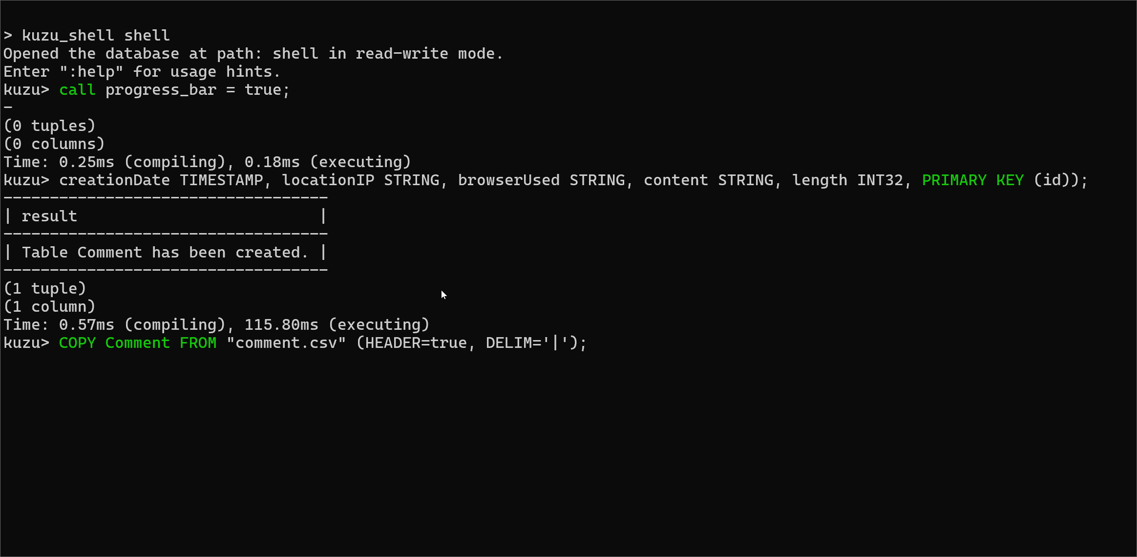 Opened the database example.lbug in read-write mode.