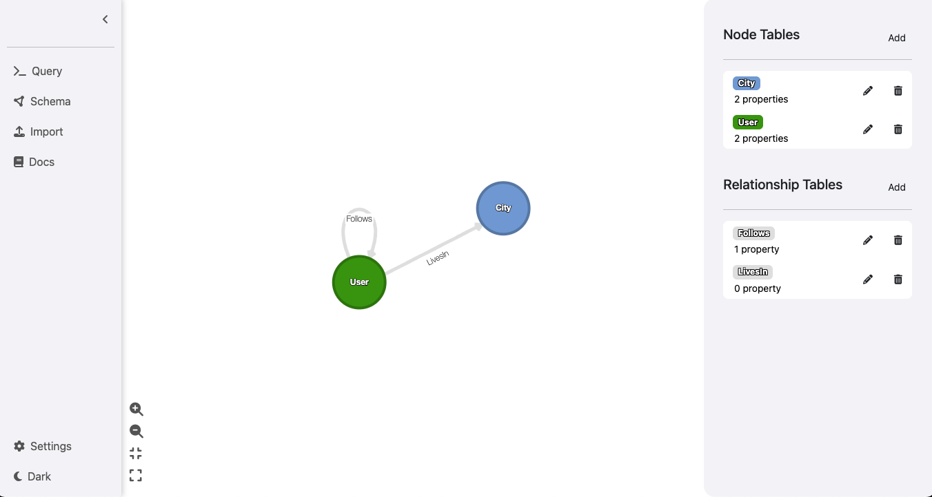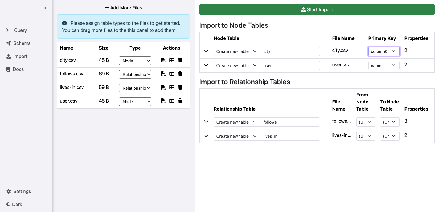 The Import Panel allows you to import data into your database from CSV or Parquet files via the UI. You can create new node/relationship tables or import data into existing tables via the imported files. To get started, click on the “Import” tab on the top right.