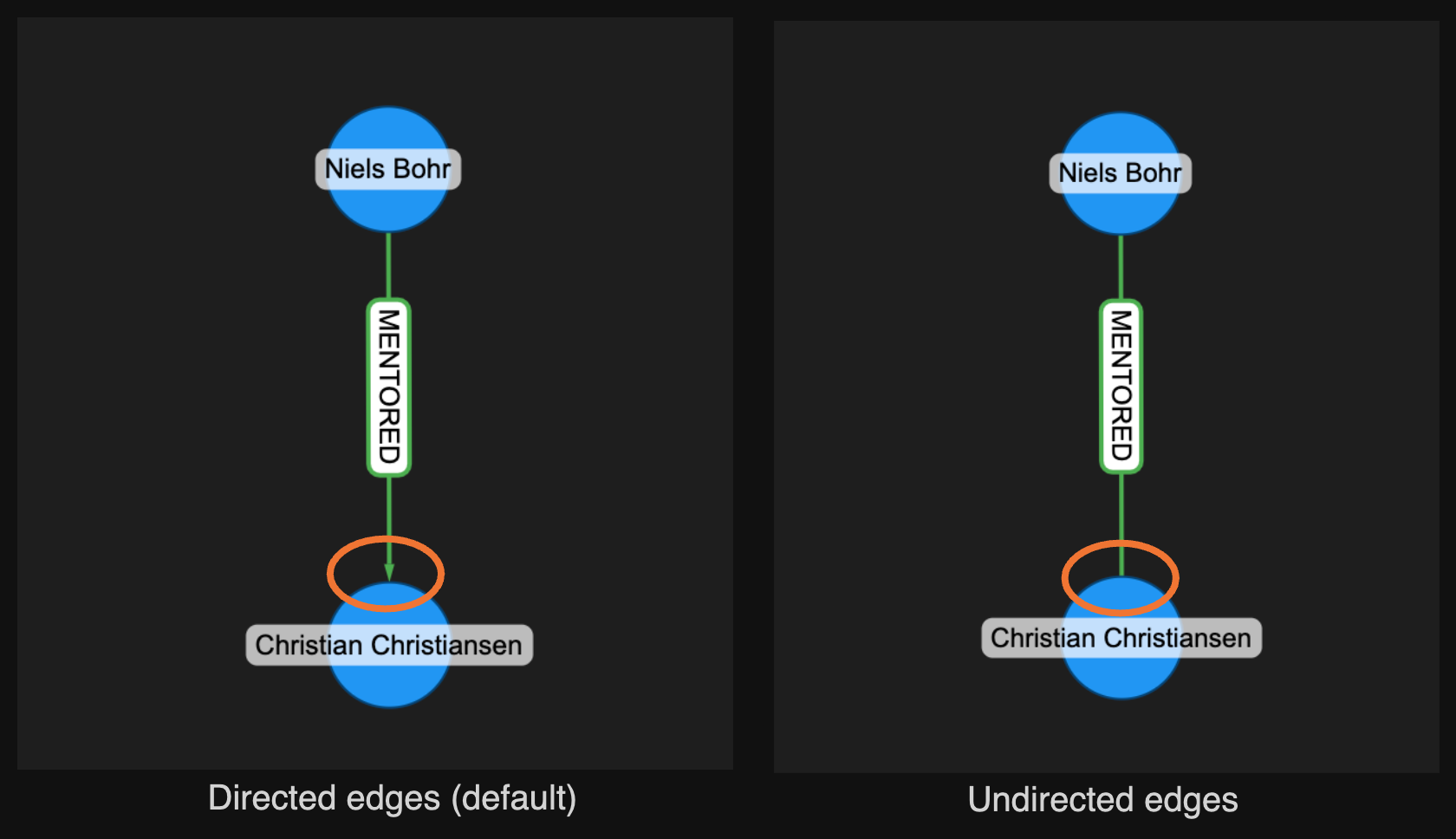 Ladybug stores all relationships as directed, but the yFiles Jupyter Graphs widget allows you to visualize them as undirected. The default behaviour in yFiles is to visualize graphs as directed, based on the source and target node IDs in each item of the result set.